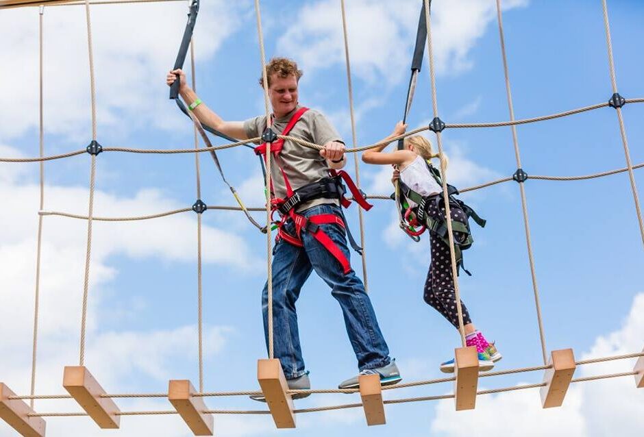High and low ropes courses challenge participants to traverse ropes, ladders, and other obstacles, often at significant heights.